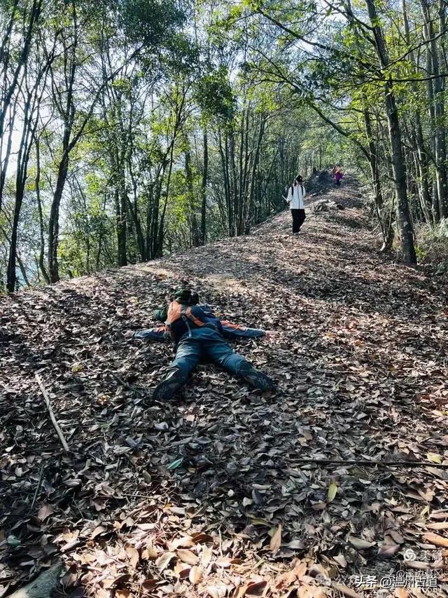 下山的路上,队长玩摆烂的造型,这是网上流行的徒步拍照姿势,年轻人都喜欢玩。