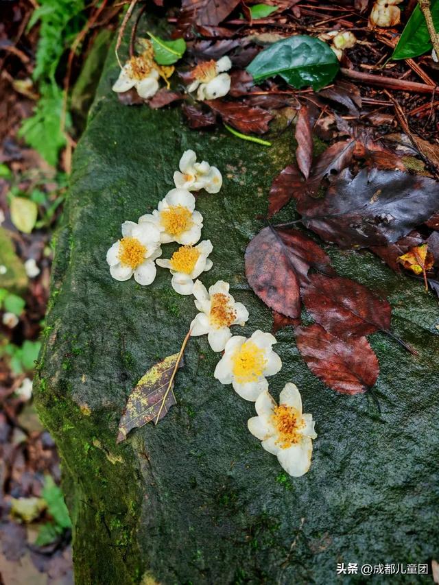 途中不仅有竹林、松树林、古梨树和老茶树,最近去的话,路上还可以看到很多茶树花,盛开在茶树上,掉落在路中间。