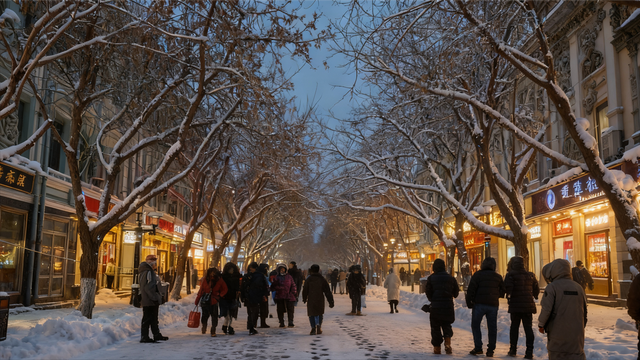 雪花完美复刻了老建筑的浮雕轮廓,南勋街至南头道街段积雪最厚,适合拍摄具有历史感的雪景大片。