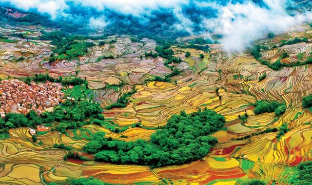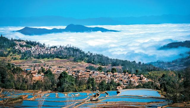 而下方的万千梯田,则是哈尼人塑造的大地艺术。梯田沿着山势蜿蜒,堪称世界农耕史上的奇观。水流汇入红河,蒸发形成降雨,再度回归森林,实现一个完美的生命循环。